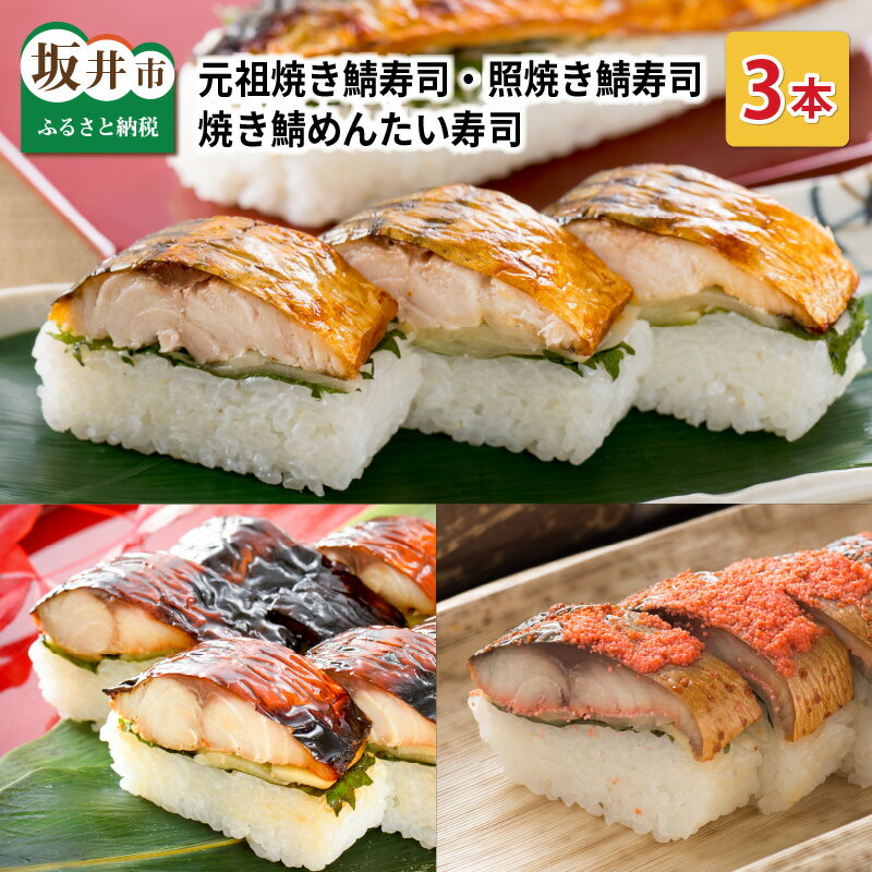【ふるさと納税】元祖焼き鯖寿司3本セット! 「元祖焼き鯖寿司」「照焼き鯖寿司」「焼き鯖めんたい寿司」〜家族が喜ぶ手土産〜【名物 ジューシー 焼きさば 押し寿司 さば寿司 すし こしひかり 贈答 ギフト お土産 大人気 食べ比べ】 10,500 円~ ★ ★ ★ ★ ★ 4.14 (7件) 提供自治体:坂井市